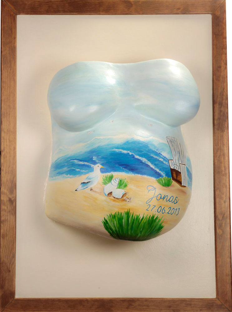 | Abdruck im rohen, nicht bearbeiteten Zustand. | Babybauch mit goldenem Holzrahmen und floralen Ornamenten in Gold , Rot und Cappuccino. Rote und braune Strasssteine funkeln im Licht als besonderes Highlight. | ||||